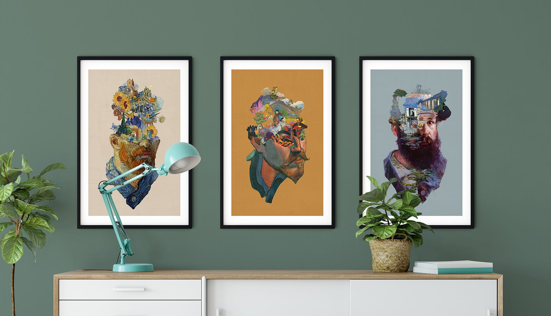 Opgebouwd uit zorgvuldig uitgesneden laagjes van bekende en minder bekende schilderijen, zoeken deze collages naar de kern van de drie kunstenaars die afgebeeld zijn: Van Gogh, Gauguin en Monet. Drie onmiskenbaar briljante schilders, drie kunstcollages als eerbetoon.