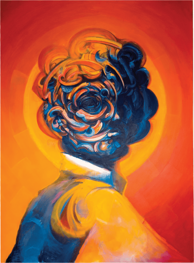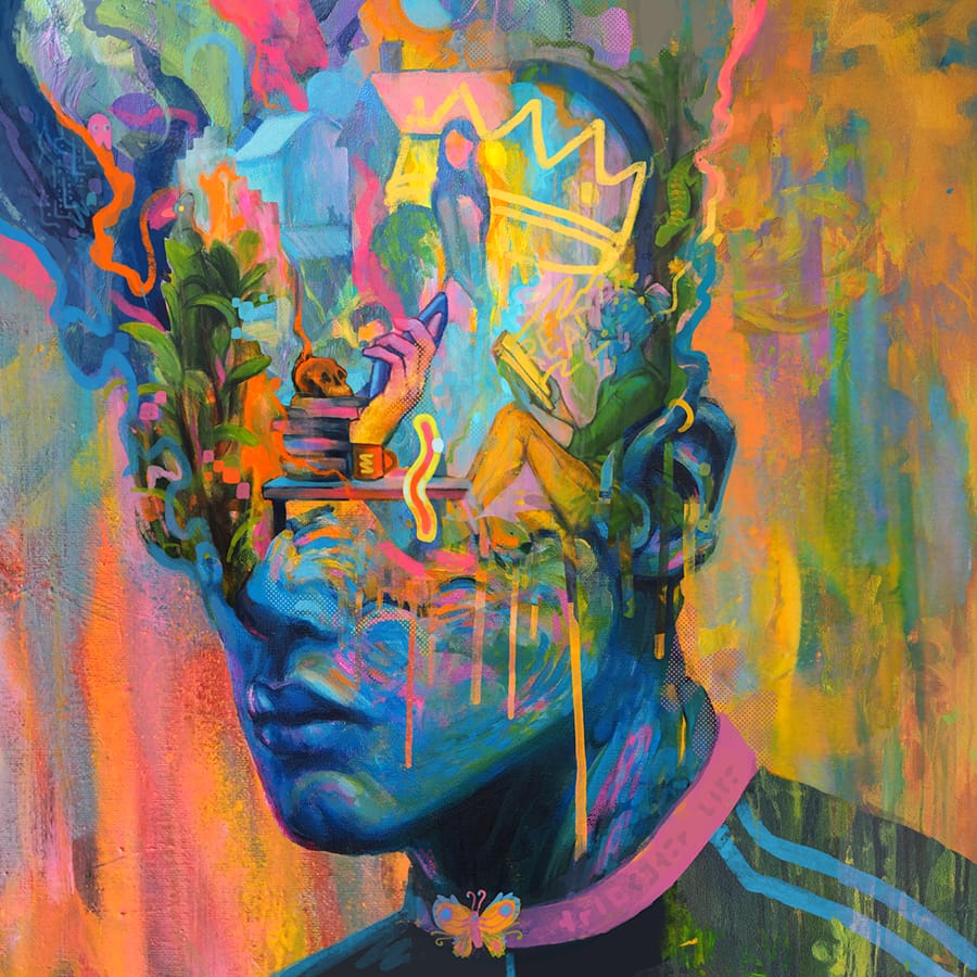 Deze serie schilderijen weerspiegelt de binnenkant in plaats van de buitenkant. Wat gebeurt er met onze hersenen wanneer er een overdaad is aan binnenkomende prikkels?